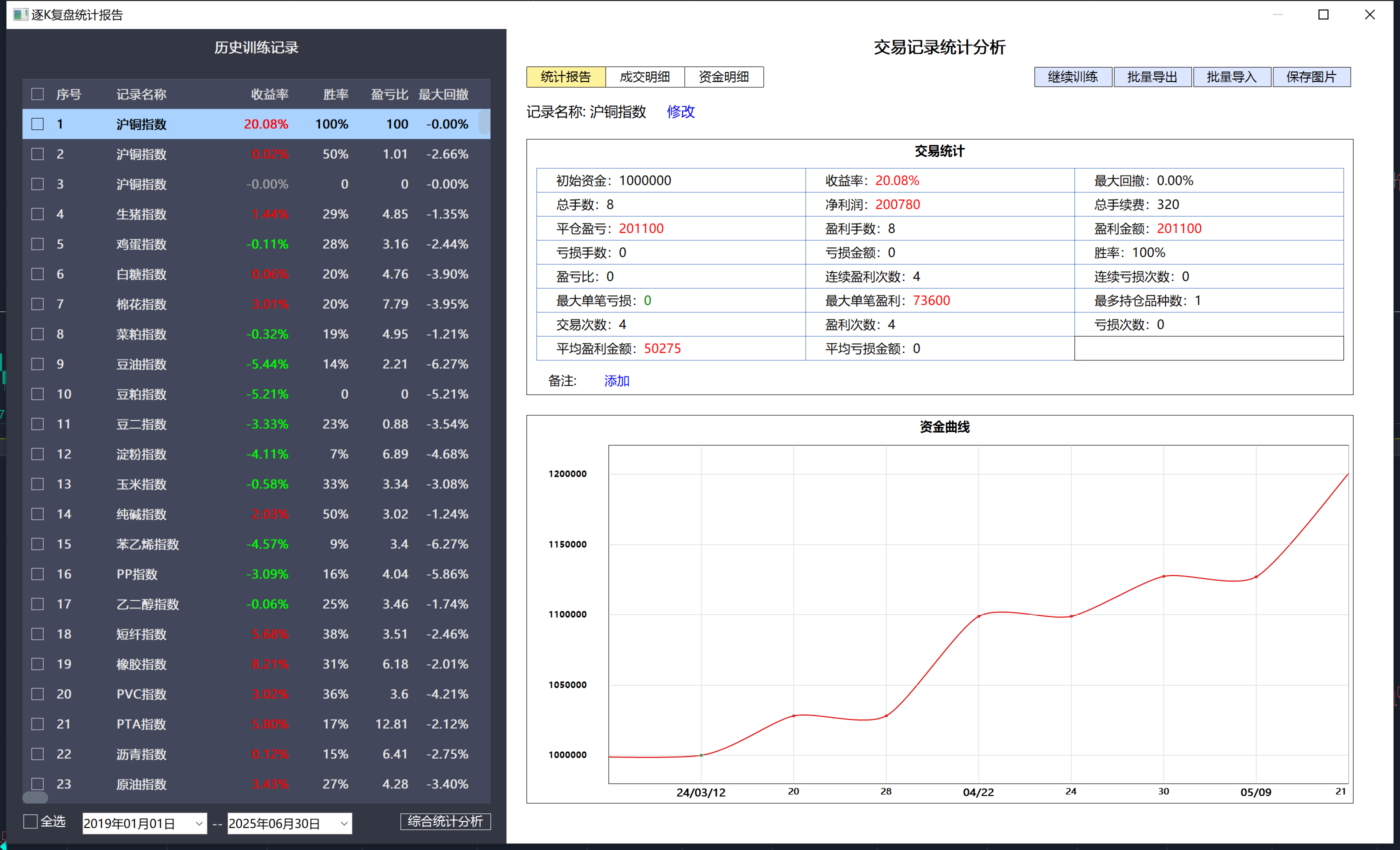 通过历史K线数据一根根播放形式查看行情,并使用交易面板训练下单交易。复盘完成后可查看复盘训练账户分析报告及资金曲线,并且可以拟合全复盘训练记录成综合资金曲线。
